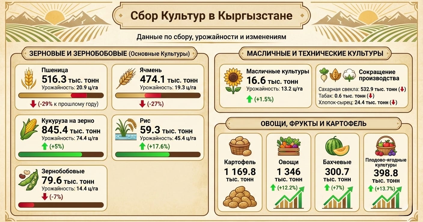 По состоянию на 23 ноября 2025 года в Кыргызстане завершена уборка основных сельскохозяйственных культур. Зерновые (без зернобобовых, риса и гречихи) убраны с площади 606 тысяч гектаров, что на 1.1% больше, чем в аналогичный период 2024 года.