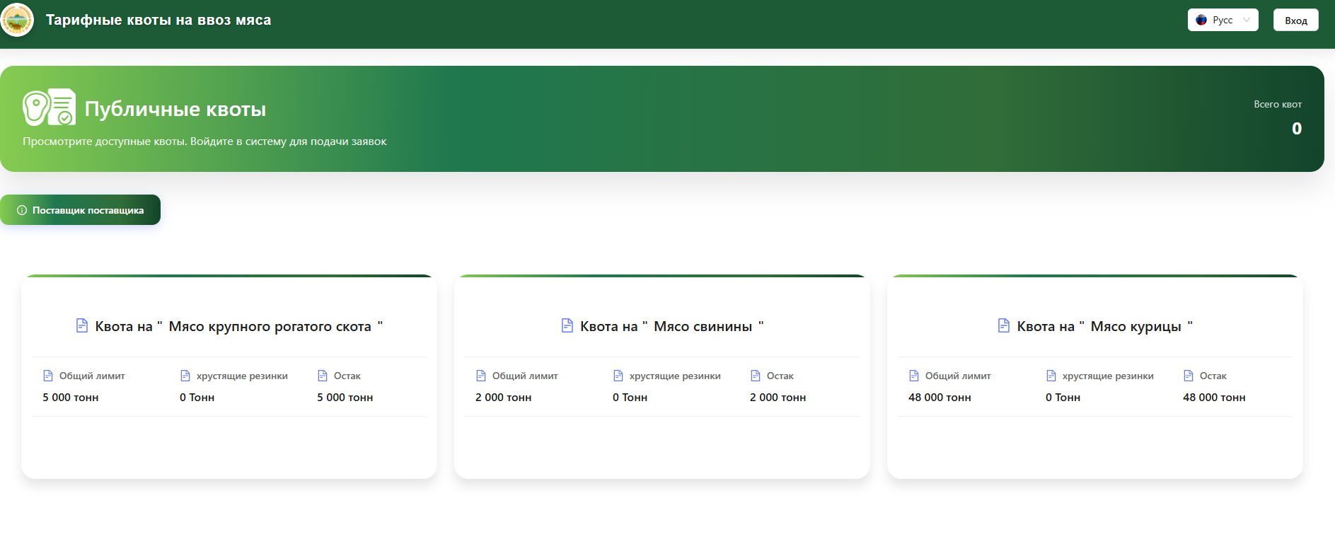 Функционал системы включает электронный прием заявок через единый портал, автоматическую проверку данных компаний через базы Минюста, распределение тарифных квот между новыми и действующими поставщиками в три этапа на основе принципов справедливости, онлайн-мониторинг объемов импорта и формирование аналитической отчетности. Кроме того, предусмотрено ведение электронных реестров заявок, квот и выданных заключений с возможностью выгрузки документов в формате PDF.