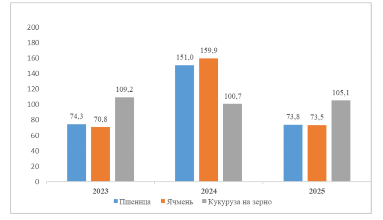 Общий намолот зерна без учета риса, гречихи и зернобобовых составил 1.8 млн тонн, что на 14.2% меньше, чем годом ранее. Ключевая причина — резкое падение урожайности пшеницы и ячменя. Сбор пшеницы сократился до 490.5 тысячи тонн (–26.2%), ячменя — до 449 тысяч тонн (–26.5%). Средняя урожайность пшеницы снизилась с 27.7 до 19.8 центнера с гектара, ячменя — с 24.7 до 18.3.