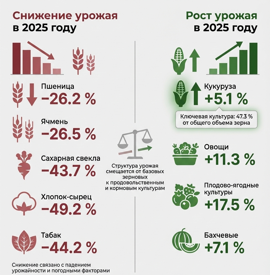 На этом фоне выделяется кукуруза на зерно. Ее валовой сбор вырос до 846.4 тысячи тонн, что на 5.1% больше, чем в 2024 году. В структуре зернового урожая именно кукуруза заняла первое место с долей 47.3%, опередив пшеницу и ячмень.