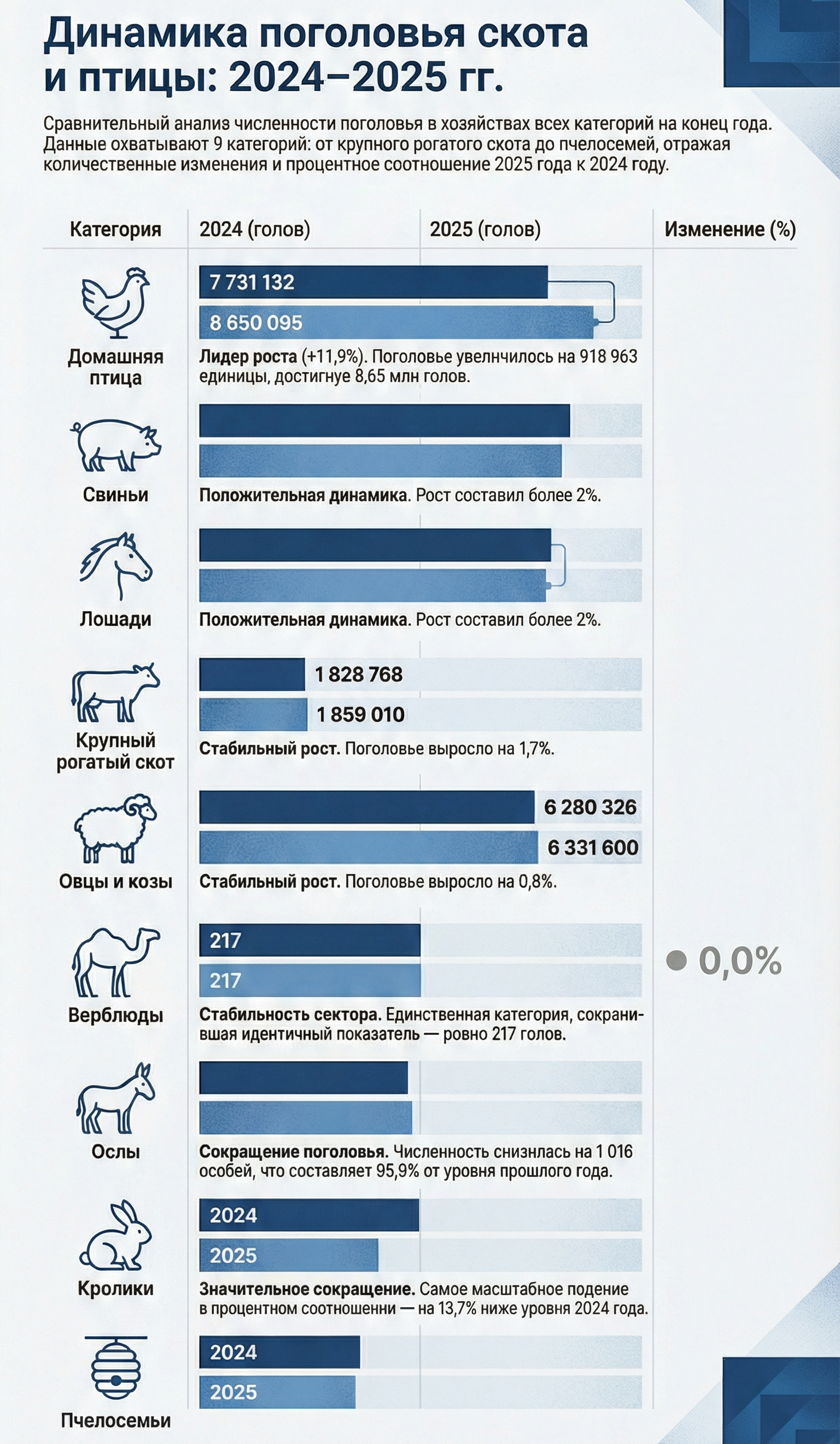Самый заметный скачок показала домашняя птица. Ее поголовье выросло с 7.7 млн до 8.65 млн — сразу на 918.96 тысячи голов или 11.9%. Это самый высокий темп среди всех категорий.