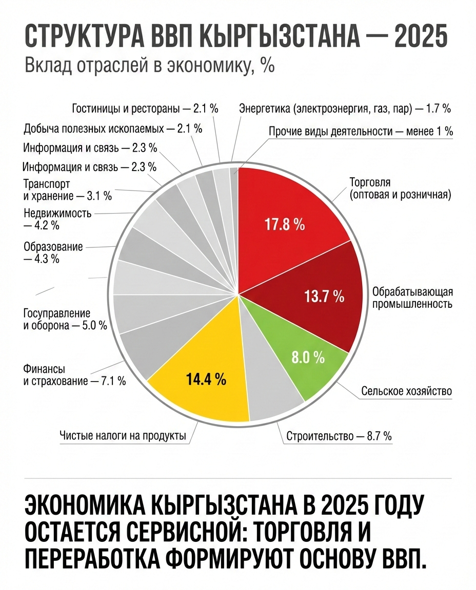 К 2025 году структура ВВП Кыргызстана заметно сместилась в сторону торговли и переработки. Согласно данным Нацстаткома, самую большую долю в экономике занимает оптовая и розничная торговля — 17.8% от общего объема. По доле других отраслей экономики можно также сделать вывод, к чему на самом деле стремится Кыргызстан.