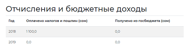 Из-за того, что портал «Открытый бюджет» Минфина не работает в полноценном режиме, выяснить сколько ТД «Арпа» выплатил налогов и платежей в бюджет не удалось. Согласно сведениям osoo.kg, в 2018 году – последний год работы компании – от нее поступило 1100 сомов.