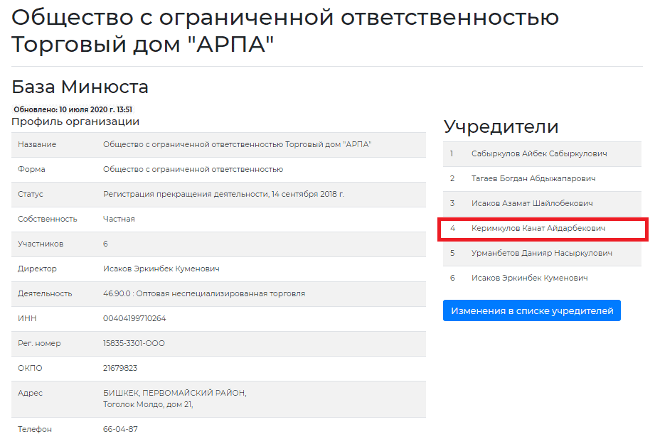 В списке его учредителей, помимо Керимкулова, еще пять человек: