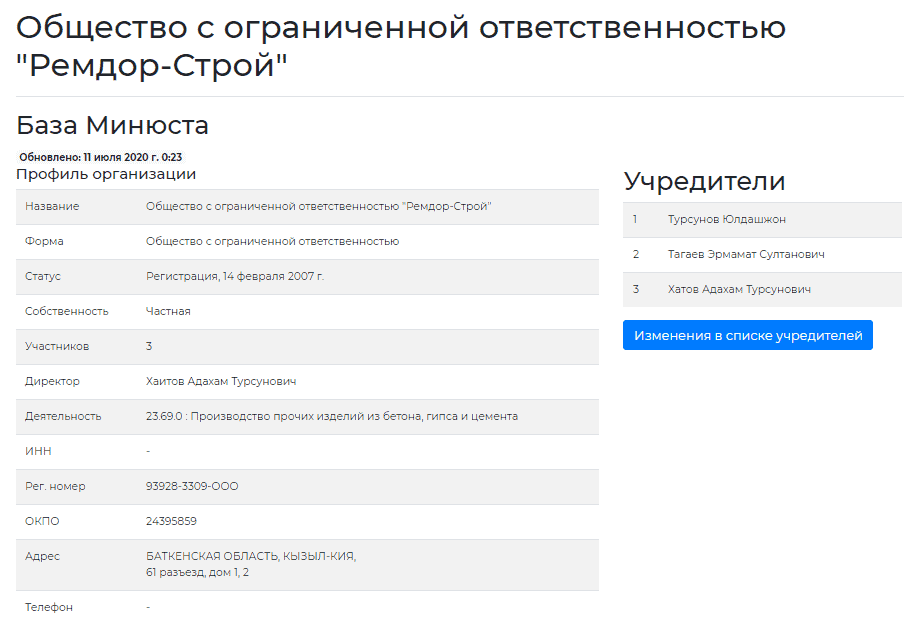 Однако одну компанию он все-таки упустил – это компания по производству прочих изделий из бетона, гипса и цемента «Ремдор-Строй». Как и предыдущие две, эта фирма зарегистрирована в Кызыл-Кие и работает с 2007 года. В списке соучредителей числится три гражданина: сам Тагаев, Турсунов Юлдашжон и Хатов Адахам Турсунович. Ни об одном из этих двух компаньонов парламентария нет никакой информации в Сети.