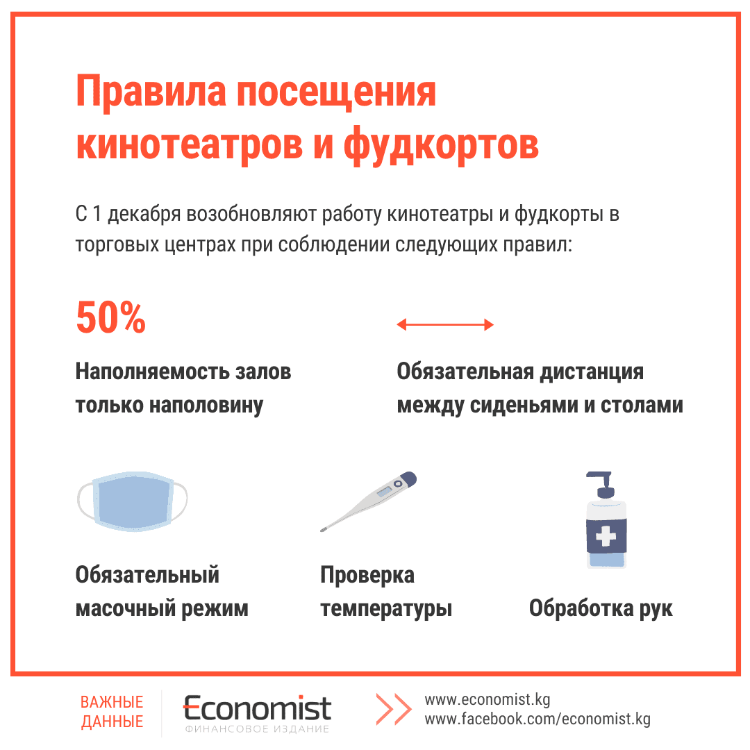 Отметим, что крупнейшая в Бишкеке сеть кинотеатров «Синематика» подтвердила открытие заведений с 1 декабря в тестовом режиме. В компании заверили, что во время посещения кинотеатров для защиты посетителей и всего персонала будут соблюдены все санитарно-эпидемиологические правила и нормы.
