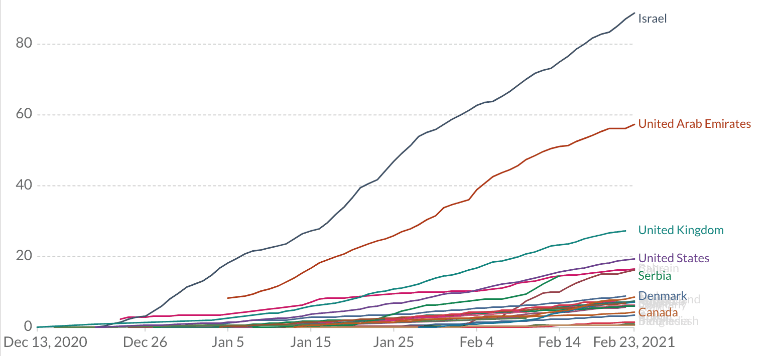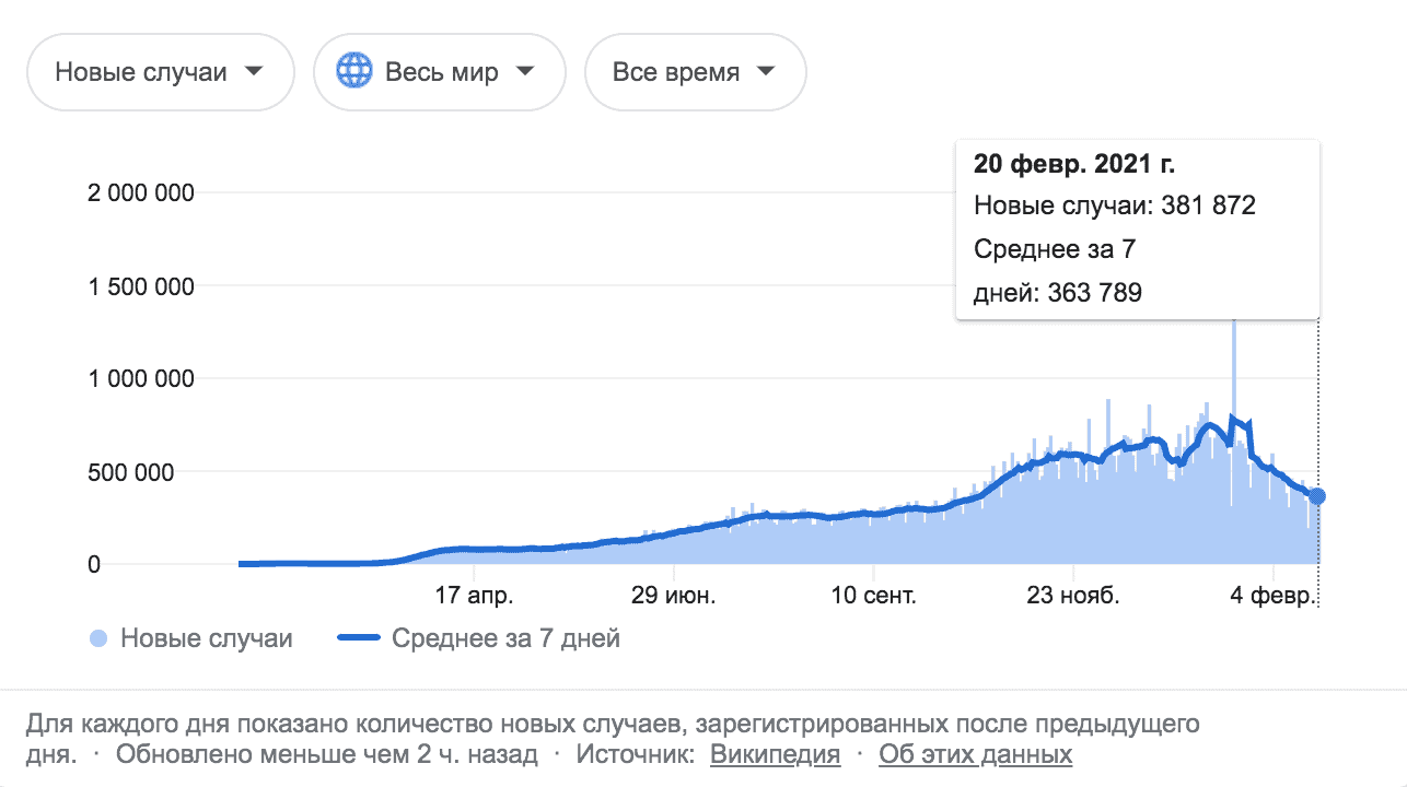 Это можно связать с началом вакцинации населения. По данным Our World in Data люди по всему миру уже начали получать прививки от вируса.