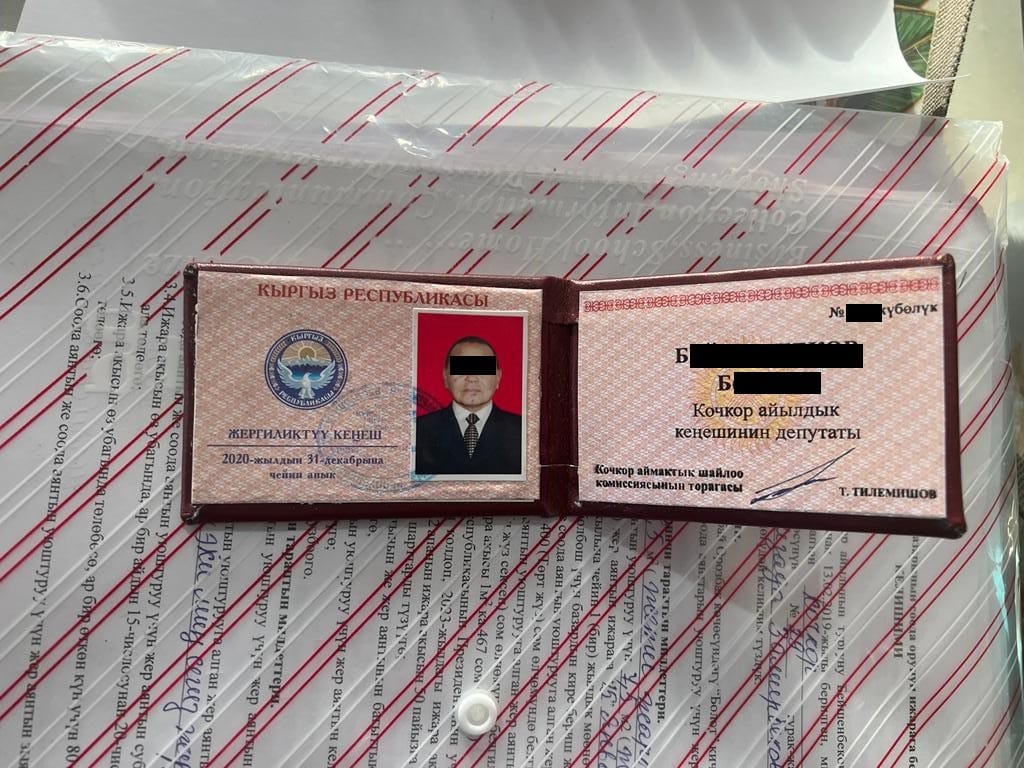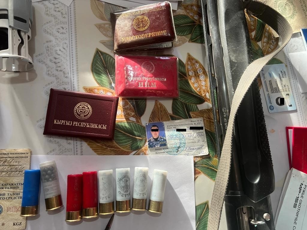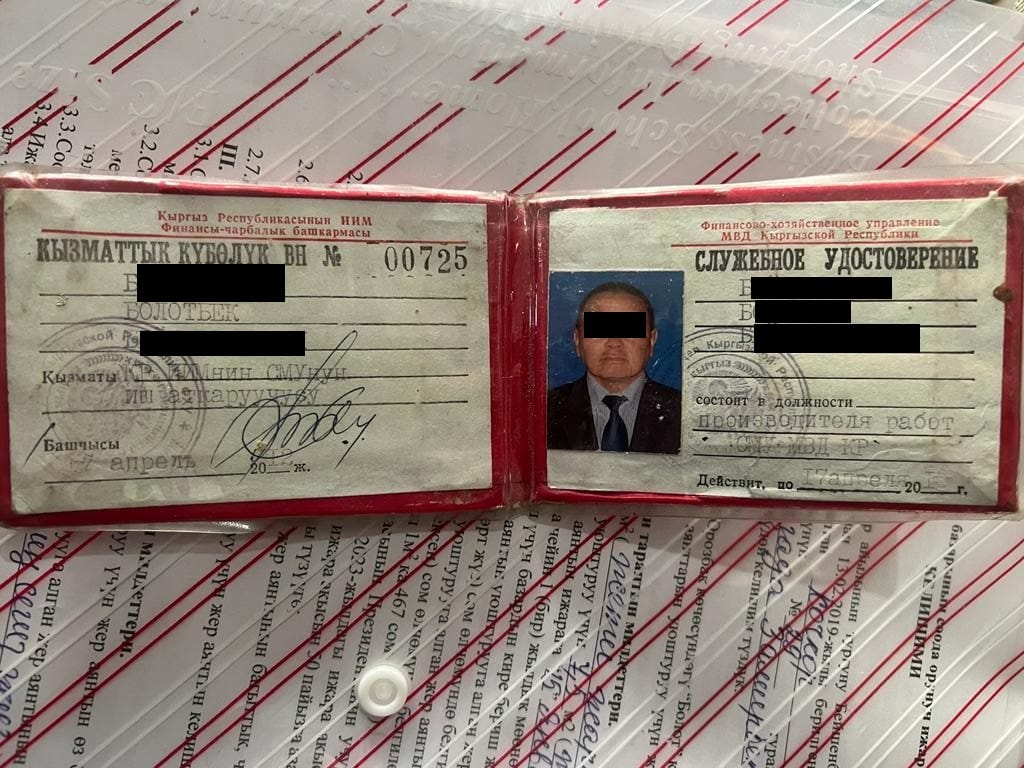 Среди изъятых документов были удостоверения сотрудника МВД и депутата Кочкорского айылного кенеша, оформленные на имя Б.Б., а также технический паспорт автомашины марки «Тойота Ленд Крузер» 2006 года выпуска, зарегистрированной на МВД КР.