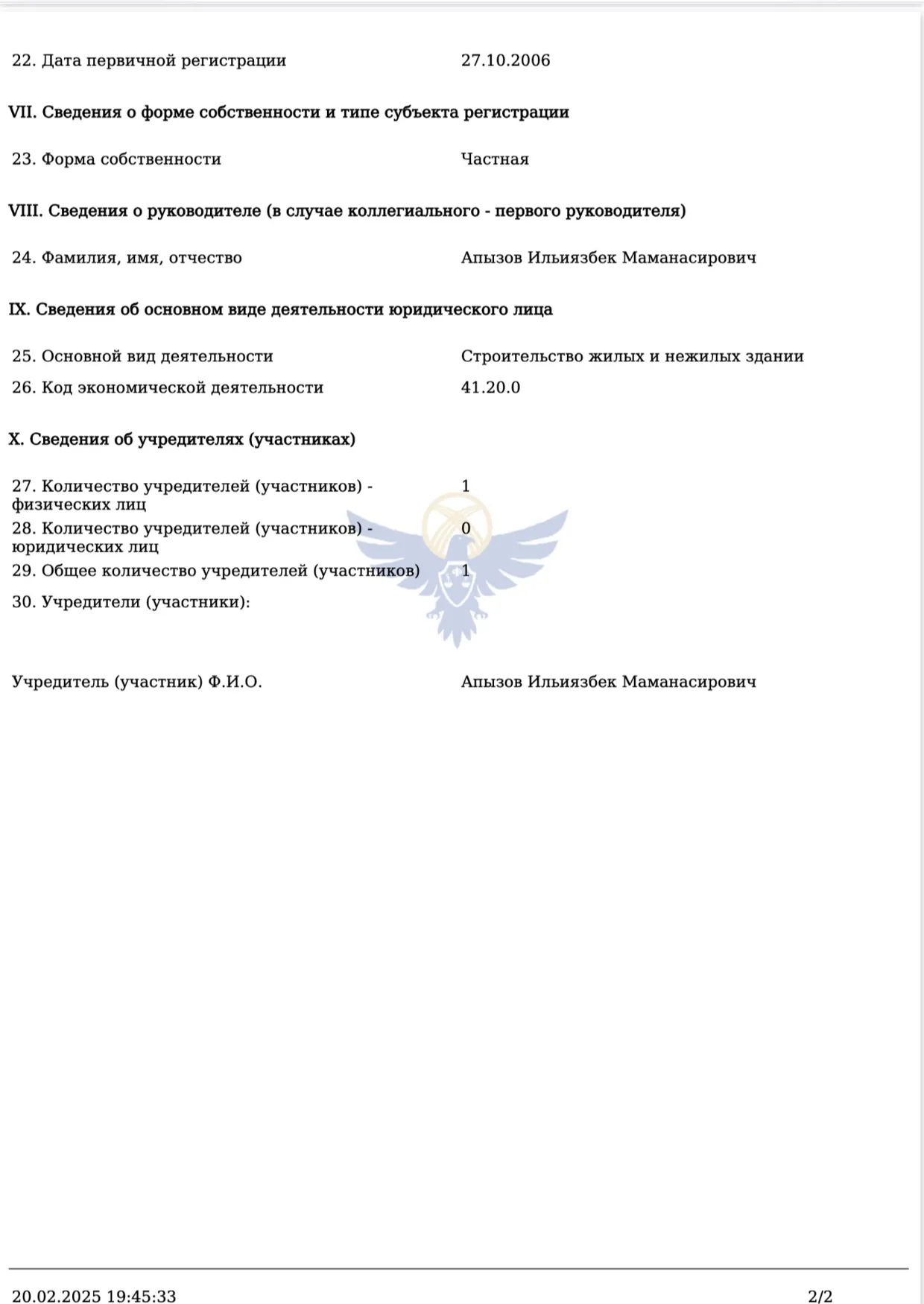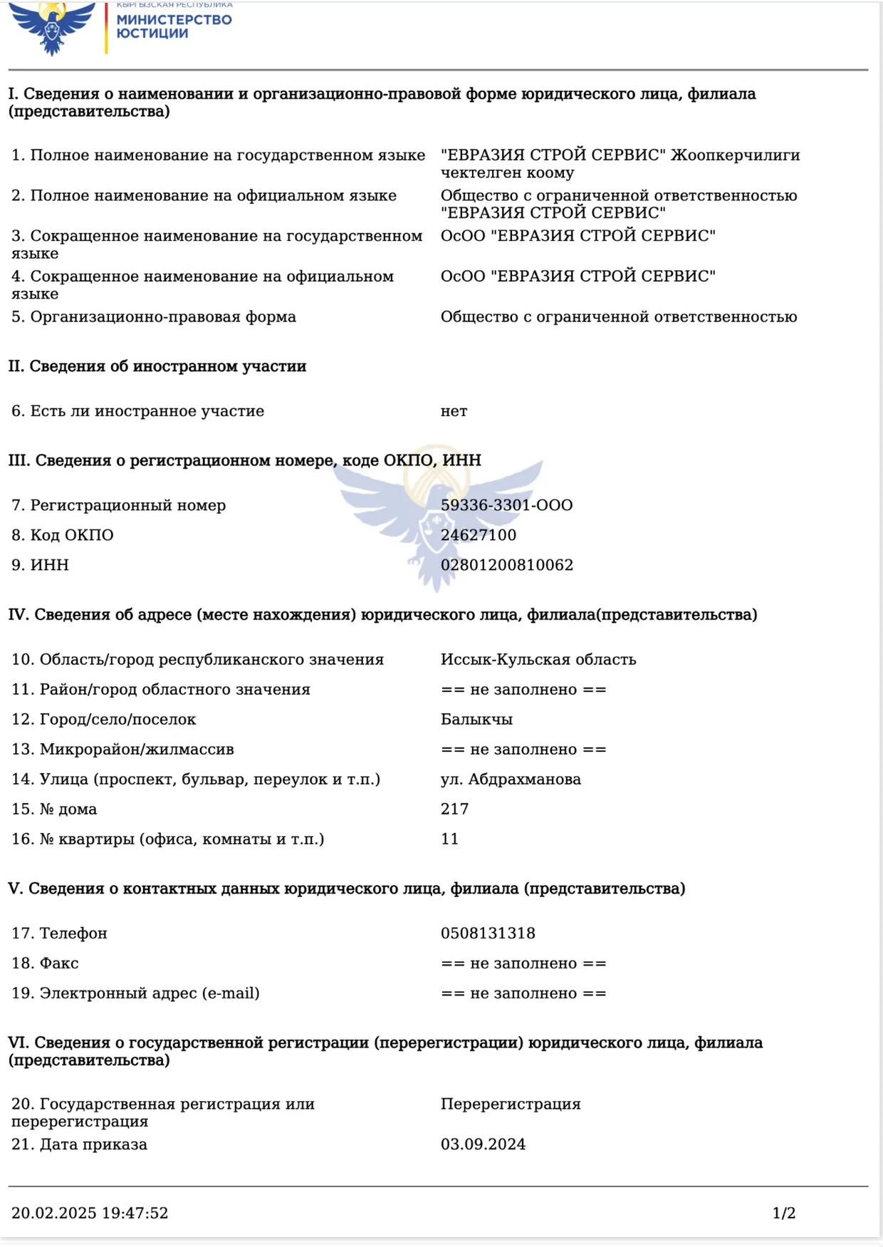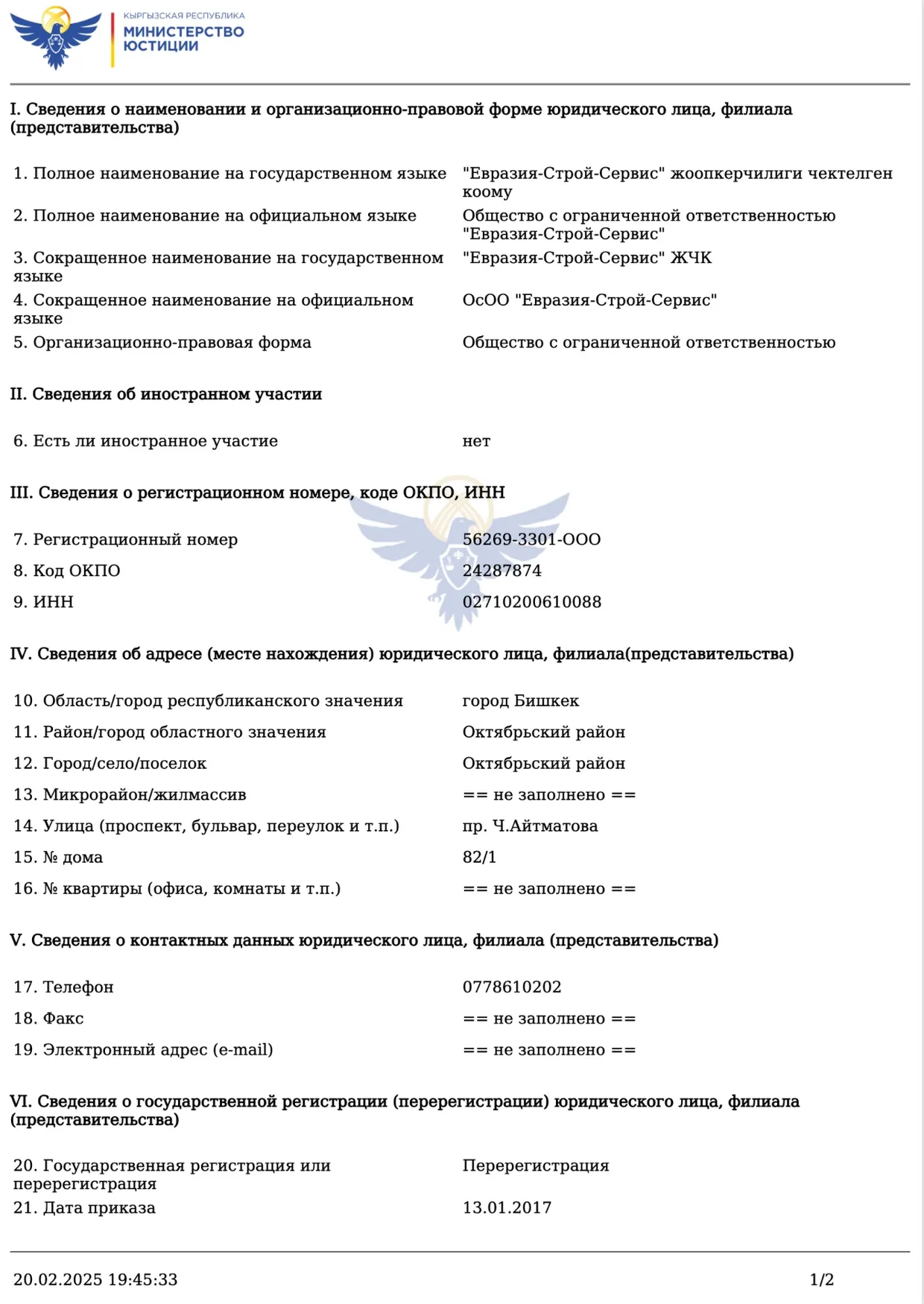 Economist.kg выяснил, что в базе данных Министерства юстиции зарегистрированы две компании с похожими названиями. В одной из них директором и учредителем числится Мээрим Молдокулова. В другой, зарегистрированной как «Евразия-Строй-Сервис», директором и учредителем является Ильиязбек Апызов, который также значится учредителем политической партии «Ала-Тоо – кыргыз жери».
