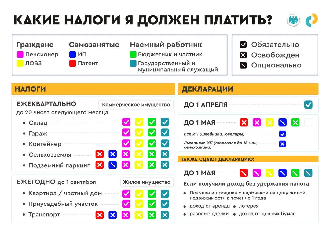 Госучреждение «Салык Сервис» представило налоговый календарь для граждан Кыргызстана с подробным разъяснением обязательств, сроков и случаев освобождения от уплат. Документ систематизирует данные для физических лиц, пенсионеров, ЛОВЗ, самозанятых (ИП, патент) и наемных работников.