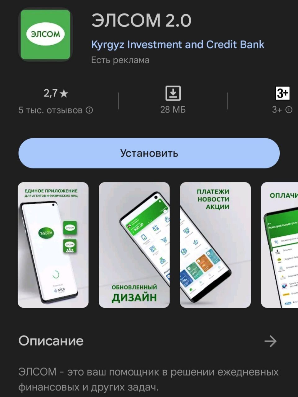 Закрывает наш рейтинг "Элсом" от "Кыргызского инвестиционно-кредитного банка" со средней оценкой 2.2 звезды. В Google Play у приложения внушительное количество загрузок (более 500 тысяч) и 5.7 тысячи отзывов, в AppStore – 798 оценок.