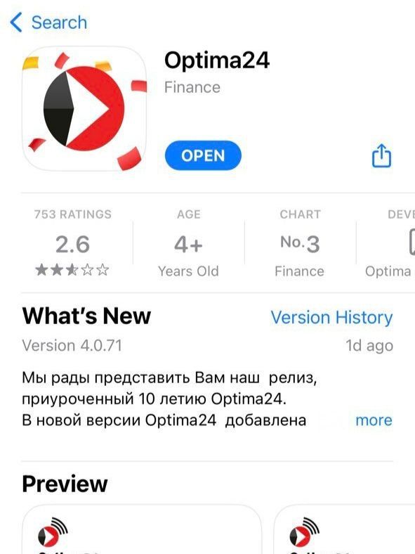 Далее следует приложение Optima24. При более чем 500 тысяч загрузок в Google Play средняя оценка мобильного банкинга составляет 3.15 звезды. В Google Play его оценили более 4.7 тысячи раз, в AppStore у приложения 753 оценки.