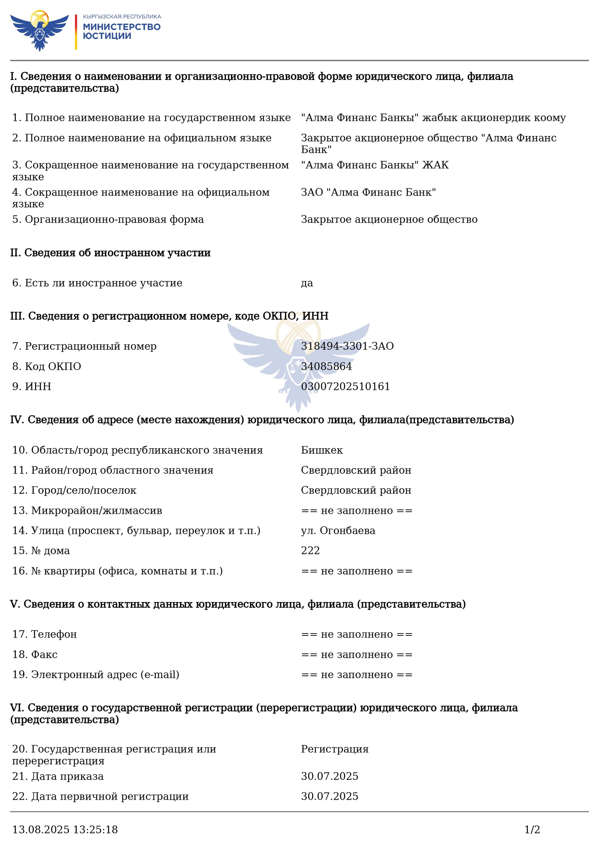 Министерство юстиции КР 30 июля 2025 года зарегистрировало ЗАО «Алма Финанс Банк». Финансово-кредитная организация создана в форме закрытого акционерного общества с участием иностранных инвесторов, следует из электронной базы данных Минюста.