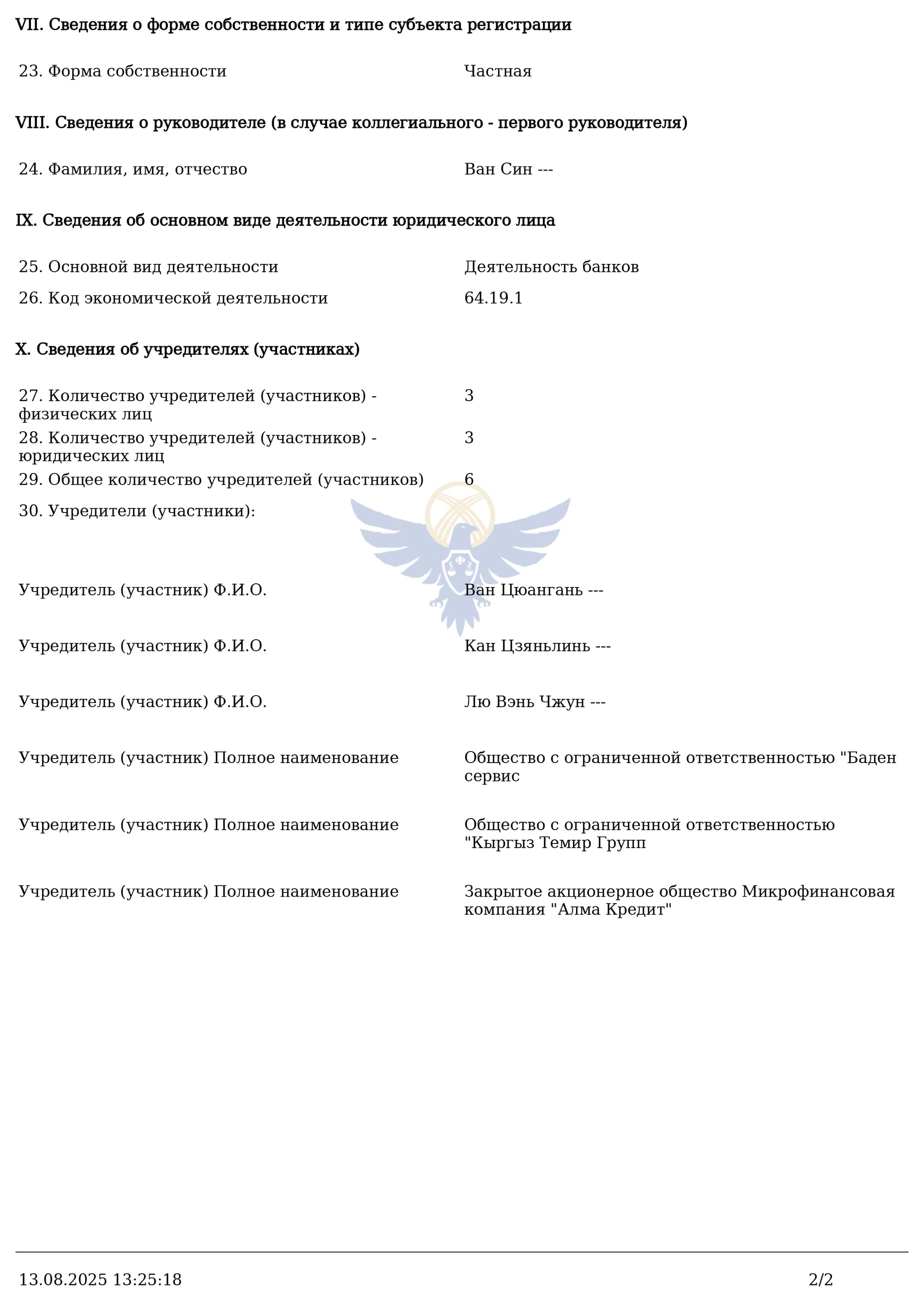 Учредителями банка выступают шесть участников, в том числе трое граждан Китая: Ван Цюангань, Кан Цзяньлинь и Лю Вэнь Чжун. Последний также входит в число учредителей двух компаний — ОсОО «Баден Сервис» (строительство жилых и нежилых зданий) и ОсОО «Кыргыз Темир Групп», которые также являются совладельцами банка. В числе юрлиц-учредителей значится и ЗАО МФК «Алма Кредит», зарегистрированное по тому же юридическому адресу, что и создаваемый банк.