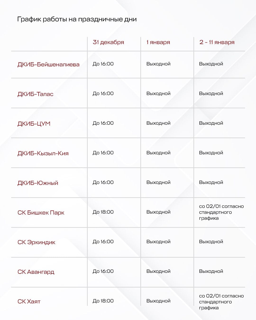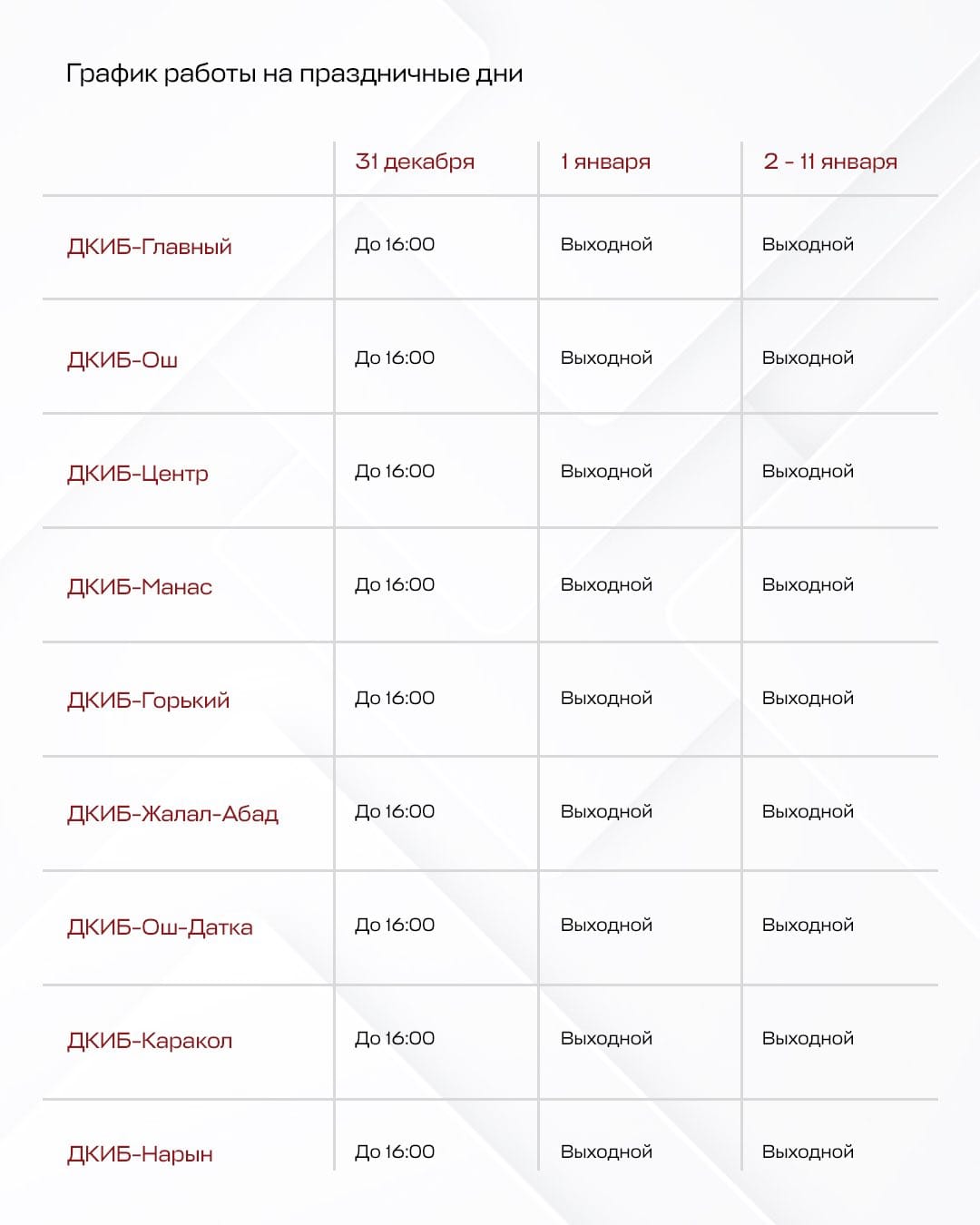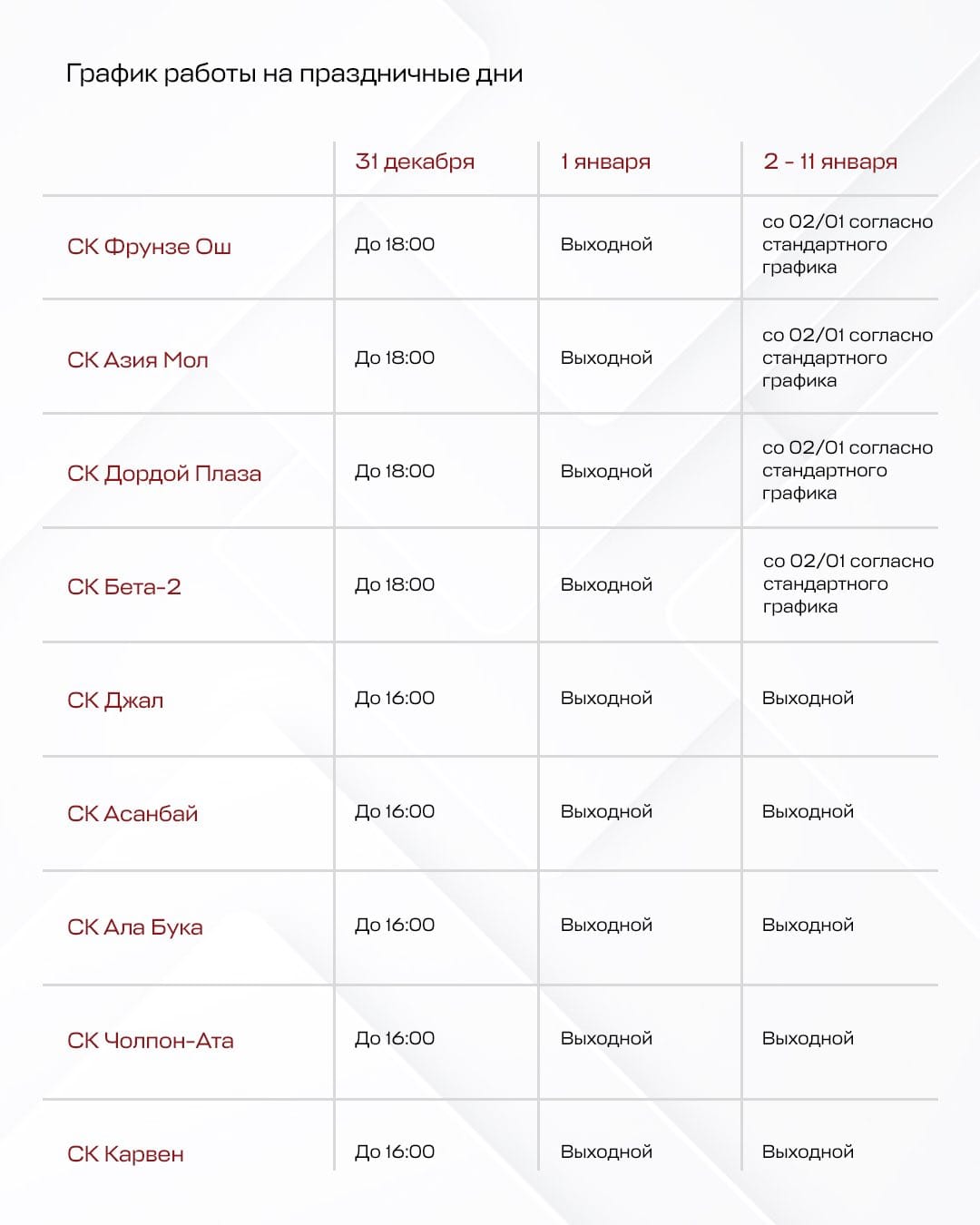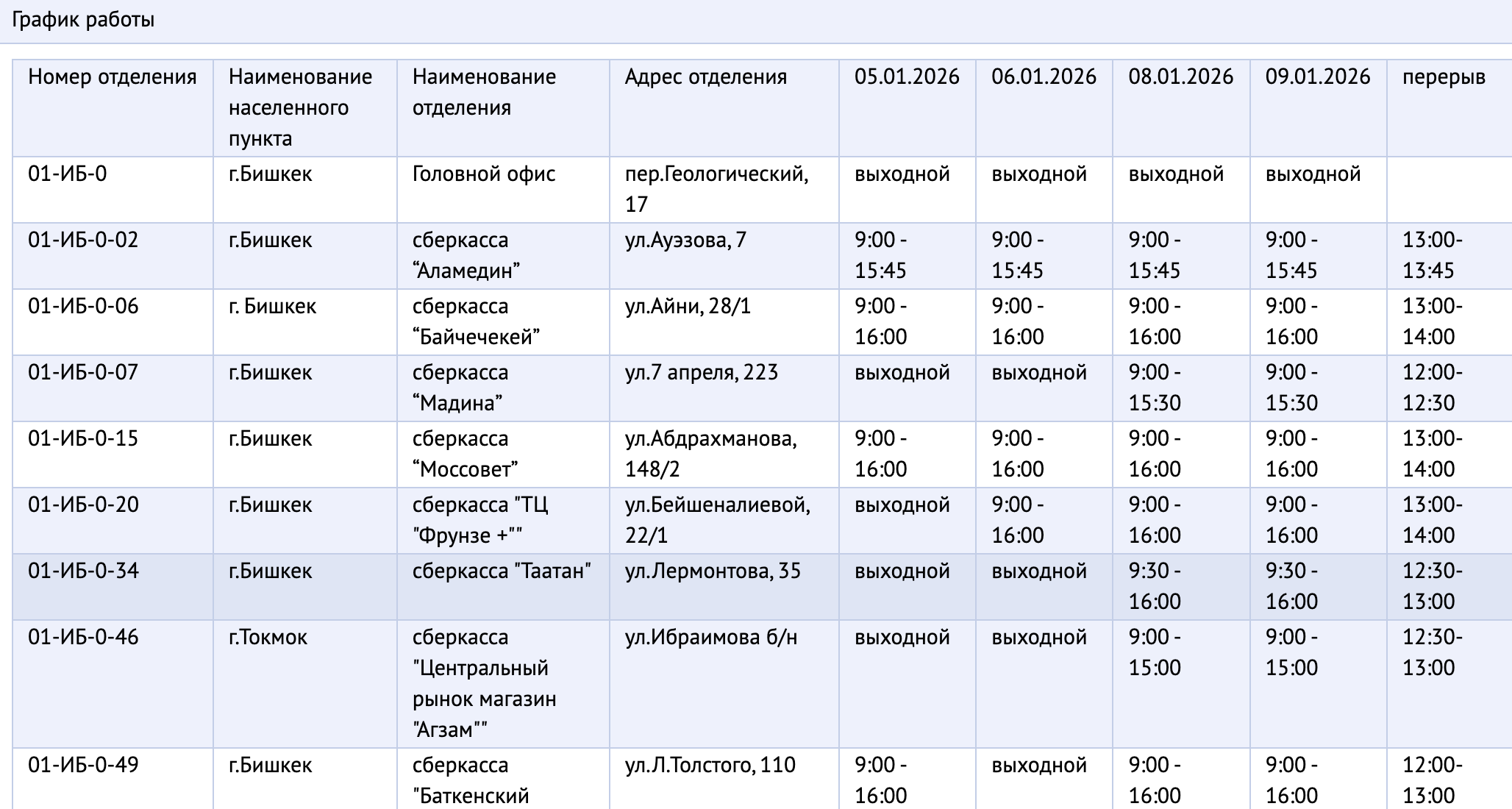 - центральный офис Ошского филиала — 5, 6, 8, 9 января;