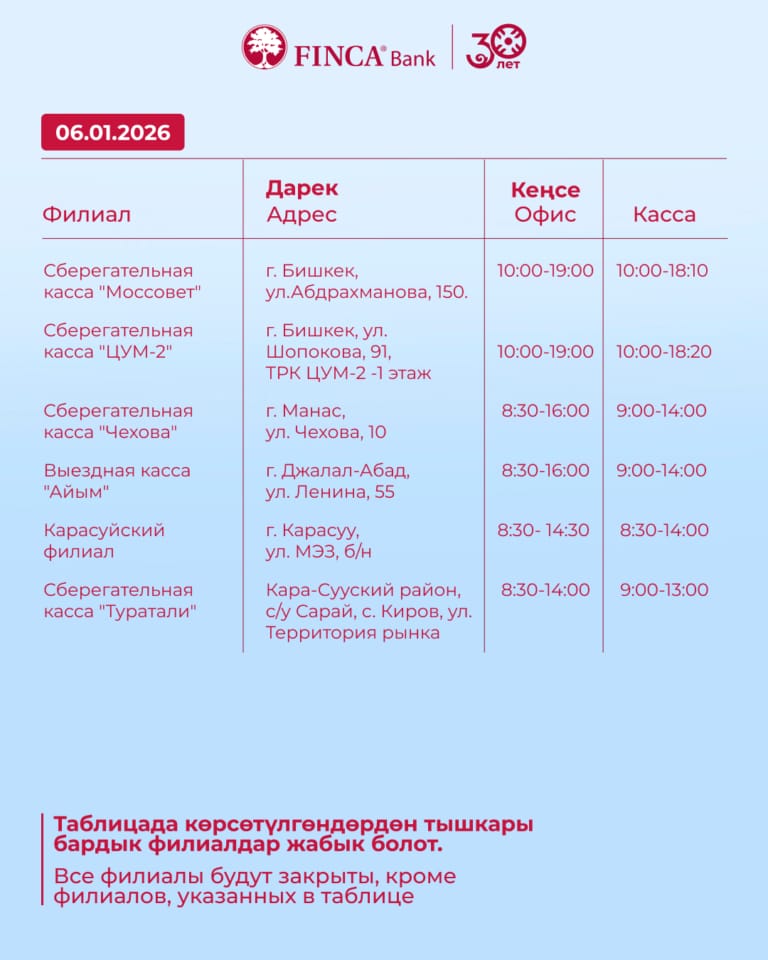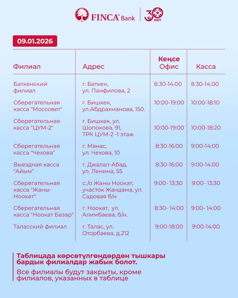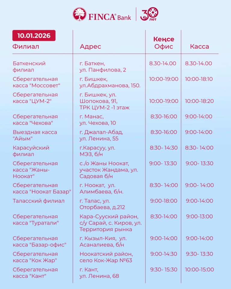 - центральный офис Баткенского филиала — 8, 9, 10 января;