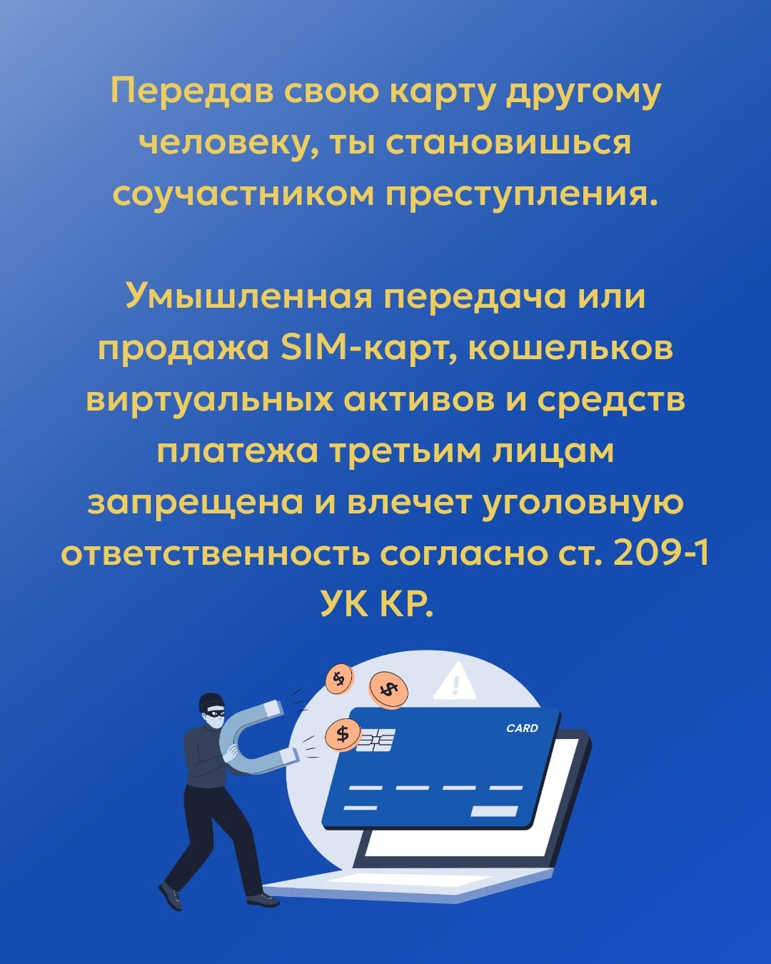 По данным регулятора, умышленная передача или продажа SIM-карт, электронных кошельков, виртуальных активов и средств платежа третьим лицам запрещена. Такие действия подпадают под статью 209-1 УК КР и влекут уголовную ответственность.