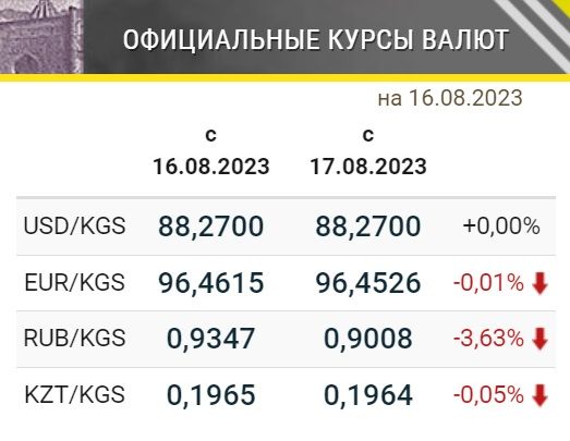 Нацбанк определил официальные курсы иностранных валют к сому, которые будут действовать с 17 августа. Согласно представленным данным, по отношению к сому резко снизился курс рубля - сразу на 3.63%. Курсы евро и казахстанского тенге также незначительно снизились, курс доллара остался без изменений.