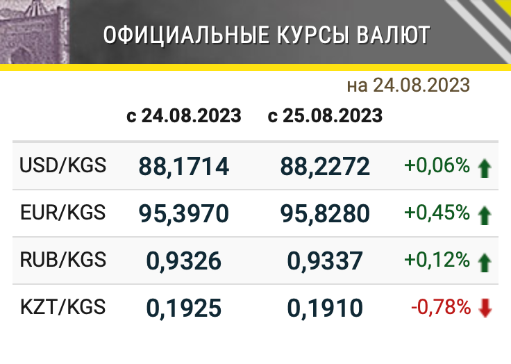 - Курс евро к сому повысился на 0.45% – до 95.8280 сомов;