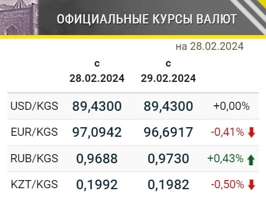 Нацбанк определил официальные курсы иностранных валют к сому, которые будут действовать с 29 февраля. Так, российская валюта продолжает отыгрывать «потери» предыдущих дней. Рубль подорожал почти на 0.5%. А вот тенге и евро примерно на такую же величину в цене к сому потеряли. Причем европейская валюта снова опустилась ниже уровня в 97 сомов. Курс доллара остался без изменений.