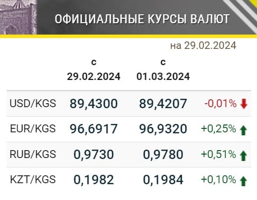 Нацбанк определил официальные курсы иностранных валют к сому, которые будут действовать с 1 марта. Так, курс доллара снизился примерно на один тыйын. Прочие валюты, наоборот, укрепили свои позиции по отношению к сому. Причем российская валюта уже третий день подряд дорожает на 0.5%. Евро вырос в цене на 0.25%. Курс тенге укрепился незначительно.