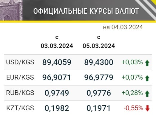 Нацбанк определил официальные курсы иностранных валют к сому, которые будут действовать с 5 марта. Так, курс доллара незначительно подорожал и вернулся к уровню 89.43 сома, на котором он неизменно находился практически весь февраль. Укрепились также российский рубль и евро. А тенге, наоборот, снизился в цене к сому.