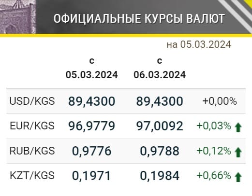 Нацбанк определил официальные курсы иностранных валют к сому, которые будут действовать с 6 марта. Так, общеевропейская валюта незначительно подорожала и превысила отметку в 97 сомов за евро. Выросли в цене рубль и тенге. Курс доллара остался без изменений.