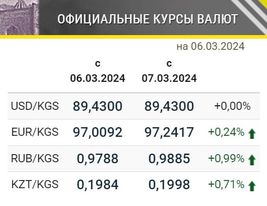 Нацбанк определил официальные курсы иностранных валют к сому, которые будут действовать с 7 марта. Так, курс рубля увеличилмя почти на 1%. Выросли в цене также тенге и евро. Курс доллара остался без изменений.