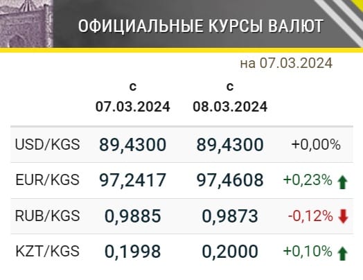 Нацбанк определил официальные курсы иностранных валют к сому, которые будут действовать в течение длинных выходных с 8 марта. Так, курс казахского тенге вырос на 0.1% до уровня пяти тенге к сому. Подорожала и общеевропейская валюта. А вот стоимость рубля незначительно снизилась. Курс доллара остался без изменений.