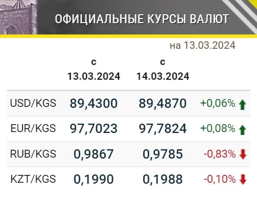 Нацбанк определил официальные курсы иностранных валют к сому, которые будут действовать с 14 марта. Так, сильно снизился курс рубля – более чем на 0.8%. А курсы евро и доллара выросли – обе валюты подорожали незначительно. Однако курс доллара вырос в том числе на фоне валютной интервенции НБКР, проведенной 12 марта с целью сдерживания стоимости доллара. Для этого регулятор продал на валютном рынке $8.35 млн.
