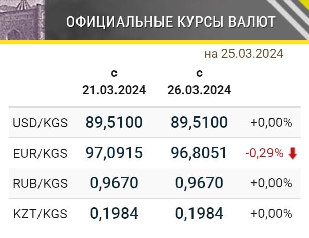 Нацбанк определил официальные курсы иностранных валют к сому, которые будут действовать в Кыргызстане с 26 марта. Так, по отношению к сому снизился курс евро. Причем стоимость евро опустилась ниже уровня в 97 сомов. Курсы остальных основных валют, котируемых НБКР, не изменились.