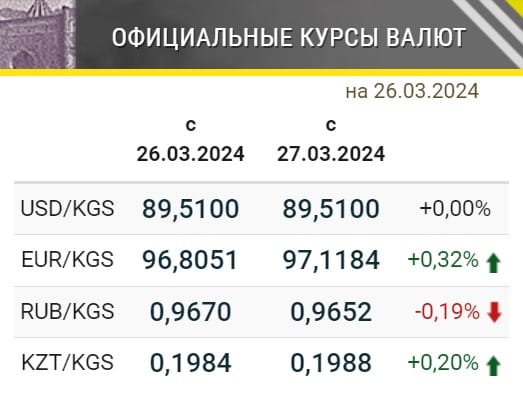 Нацбанк определил официальные курсы иностранных валют к сому, которые будут действовать в Кыргызстане с 27 марта. Так, по отношению к сому выросла стоимость евро. Курс общеевропейской валюты вернулся на уровень выше 97 сомов. Подорожал также казахстанский тенге, а рубль опустился в цене. Курс доллара остался без изменений.