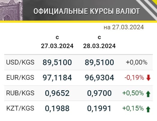 Нацбанк определил официальные курсы иностранных валют к сому, которые будут действовать в Кыргызстане с 28 марта. Так, по отношению к сому выросла стоимость рубля, причем сразу на 0.5%. Подорожал также казахстанский тенге, а евро опустился в цене и снова оказался дешевле 97 сомов. Курс доллара остался без изменений.