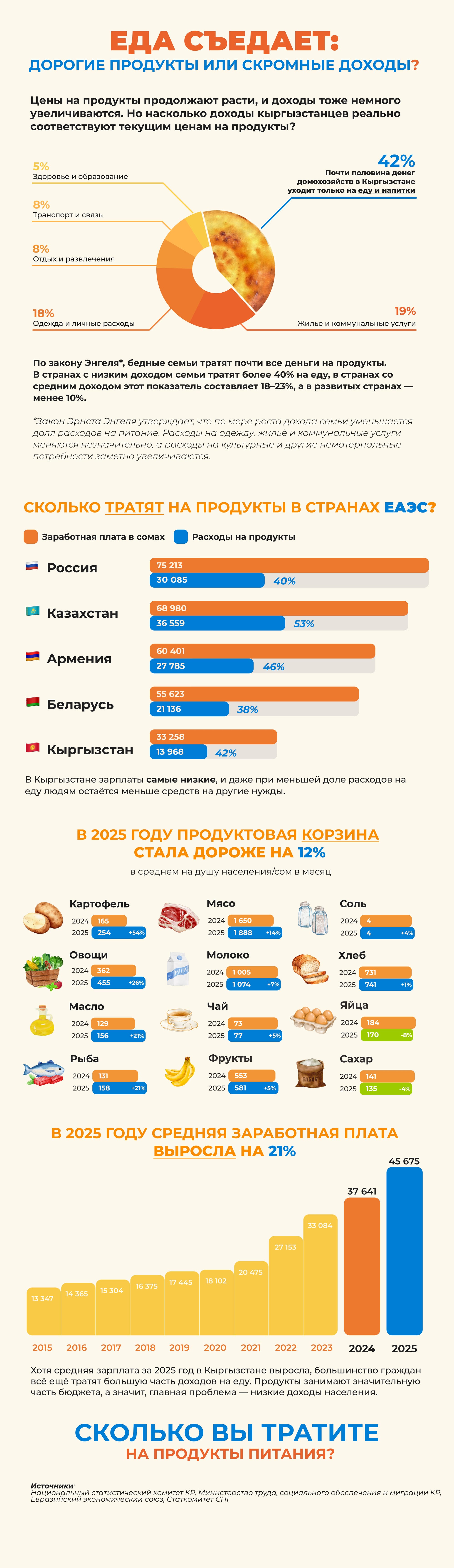 Подробнее о том, сколько сегодня кыргызстанцы тратят на еду и как изменилась продуктовая корзина за год — в дата-обзоре.