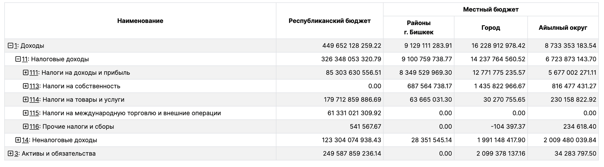 В местных бюджетах динамика оказалась разнонаправленной. В Бишкеке общие доходы выросли на 5.3%, налоговые доходы также увеличились на 5.3%, при этом налоги на доходы и прибыль прибавили 11.5%, а налоги на товары и услуги — 75.0%. В прочих городах доходы выросли на 15.0%, налоговые поступления увеличились на 15.6%, включая налоги на доходы и прибыль (+19.6%) и налоги на товары и услуги (+26.4%). Для айыльных округов ситуация сложнее: общие доходы снизились на 2.5%, налоговые доходы упали на 10.1%, при этом налоги на доходы и прибыль сократились на 4.3%, а налоги на собственность и прочие сборы показали падение на 39.7% и 64.8% соответственно.