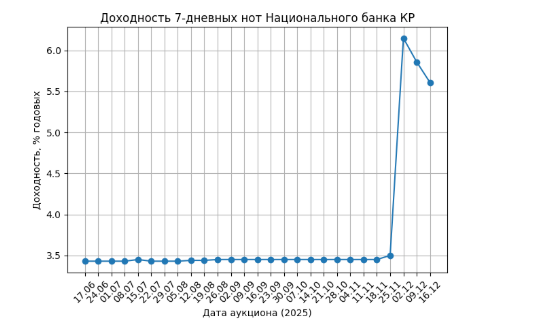 Доходность 7-дневных нот Национального банка с июня по конец ноября 2025 года находилась практически в неизменном диапазоне 3.43–3.45%, что свидетельствовало о нейтральном режиме операционного управления ликвидностью и отсутствии необходимости в повышении стоимости краткосрочных денег.