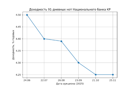 В сегменте 91-дневных нот динамика была более сглаженной. В течение 2025 года их доходность постепенно снижалась с 4.5% в июне до 4.25% к октябрю–ноябрю, без резких колебаний и скачков. В отличие от краткосрочных инструментов, этот сегмент не отреагировал на декабрьское ужесточение, что указывает на стабильные ожидания рынка на горизонте трех месяцев.