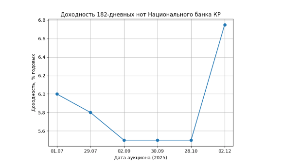 Иная картина наблюдалась по 182-дневным нотам. В течение лета и начала осени их доходность постепенно снижалась — с 6% в июле до 5.5% к сентябрю–октябрю, после чего на этом уровне сформировалось устойчивое плато. Однако в декабре произошло заметное изменение: по итогам аукциона 2 декабря доходность 182-дневных нот выросла до 6.75%. Это указывает на расширение масштабов ужесточения денежного рынка, когда корректировка затронула не только краткосрочный, но и полугодовой горизонт.