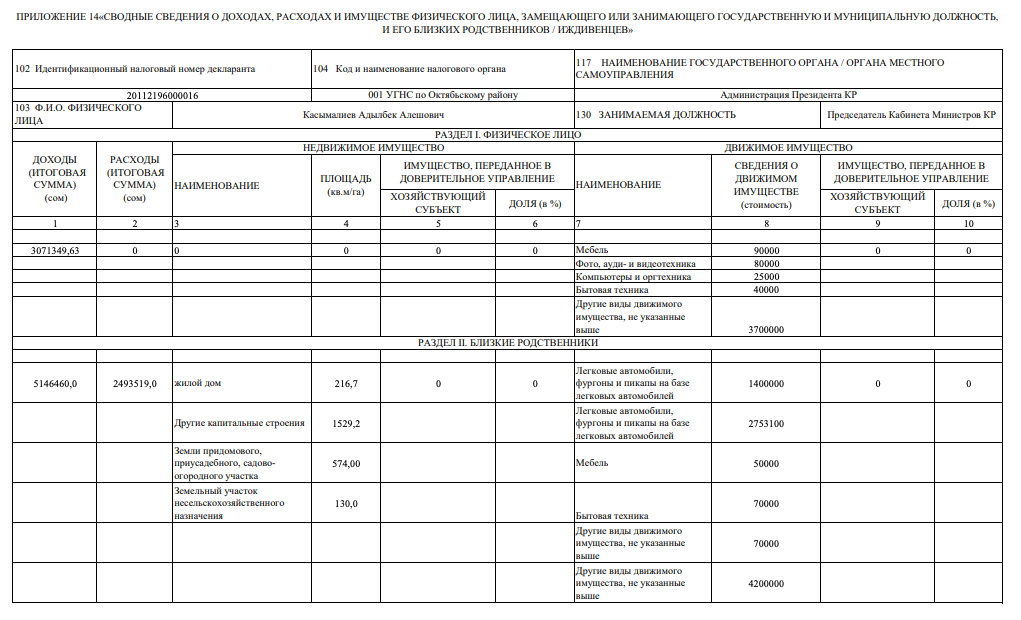 В разделе движимого имущества близких главы кабмина отражены легковые автомобили общей стоимостью 4 млн 153 тысячи 100 сомов, мебель на 50 тысяч сомов, бытовая техника на 70 тысяч сомов, а также иные виды движимого имущества на сумму 4 млн 270 тысяч сомов.