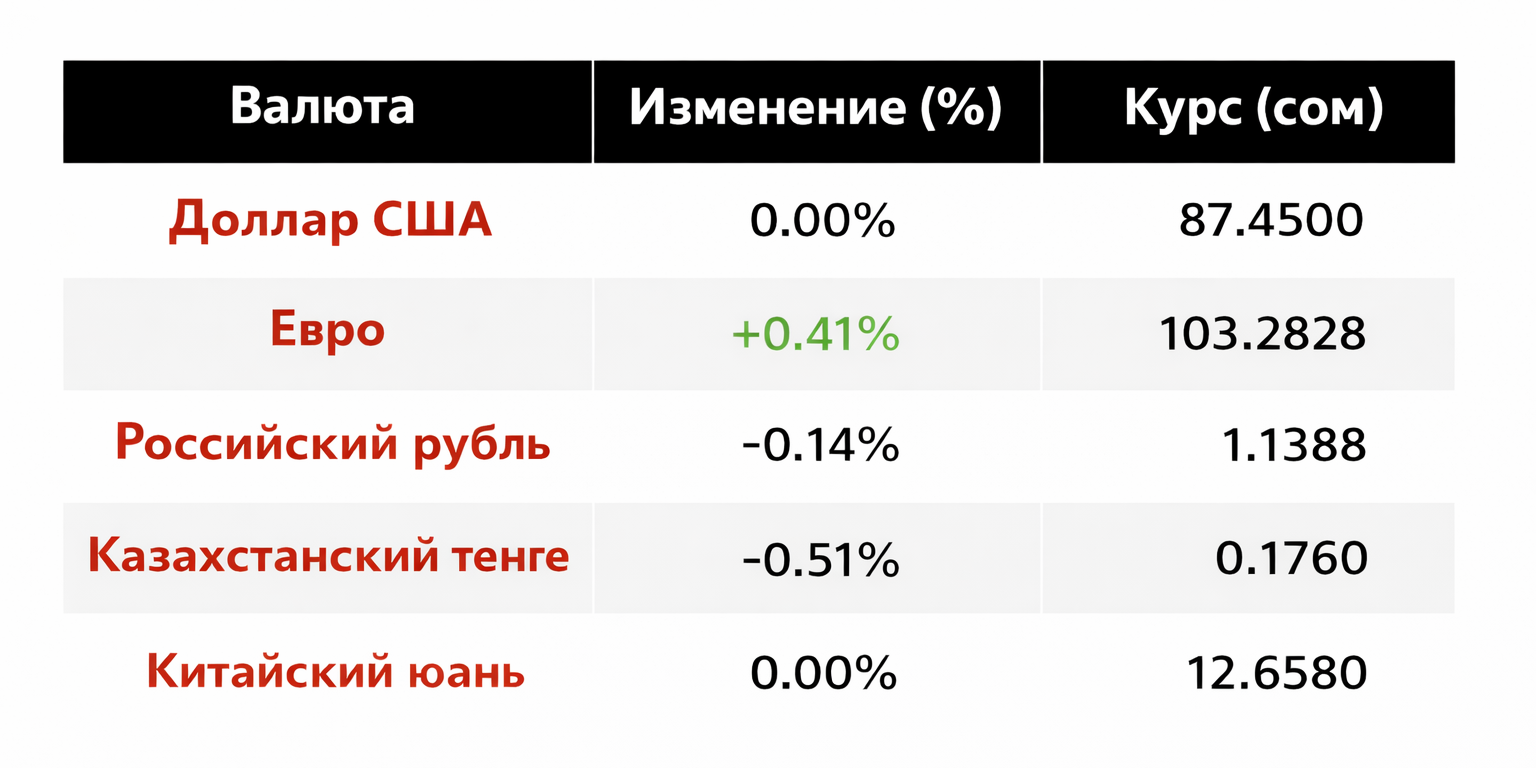При этом европейская валюта показала заметный рост: курс евро поднялся на 0.41%, достигнув отметки 103.2828 сома.