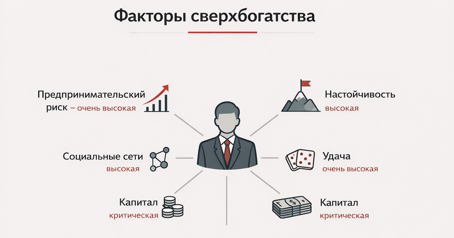 Именно сочетание этих факторов чаще всего определяет, кто поднимается в верхние уровни распределения богатства.