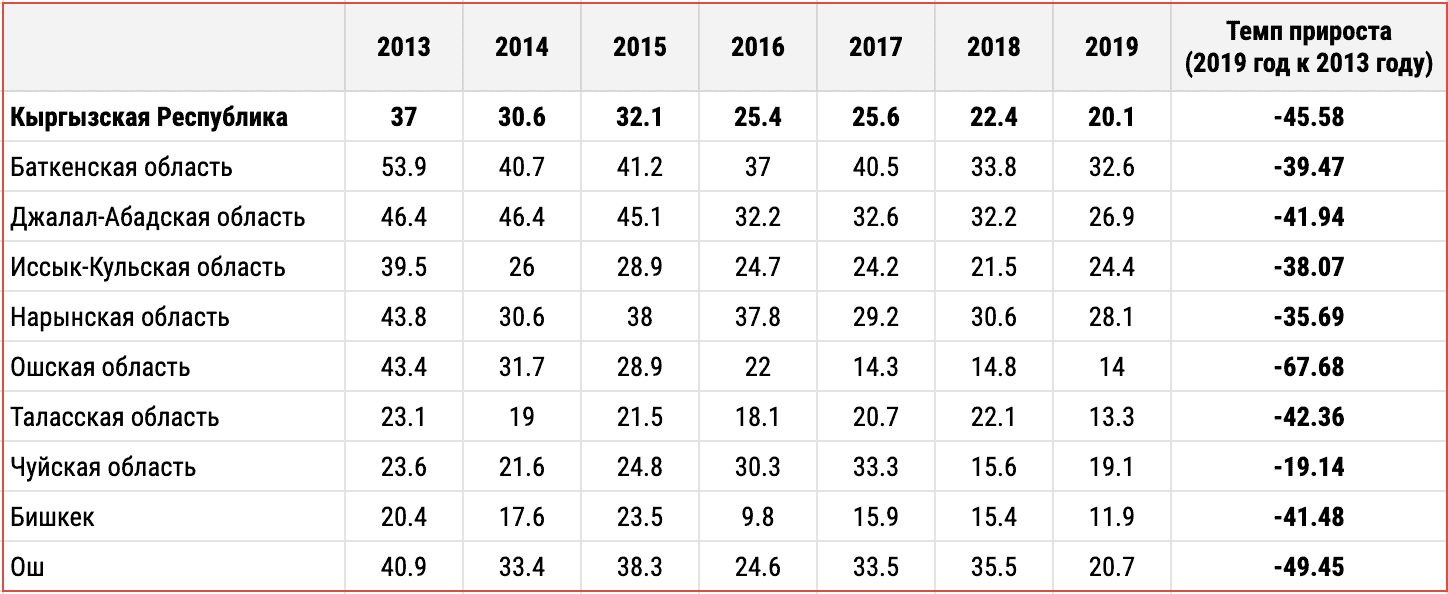 Динамика уровня бедности в Кыргызстане за 2013-2019 года (в процентах)