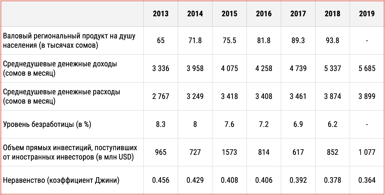 В 2019 году средний доход составил 5 тысяч 684 сомов, что на 6.5 % больше чем в 2018 году, прожиточный минимум республики на душу населения на 2019 год составил 4 тысячи 806 сомов в месяц.