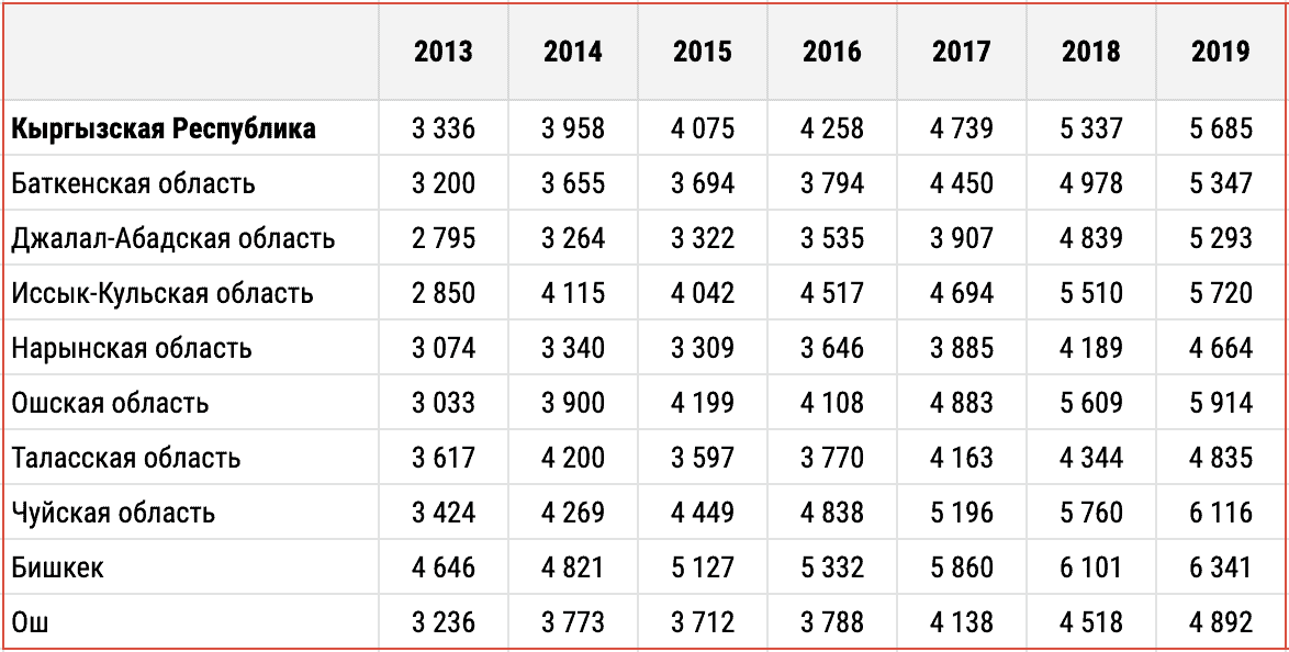 Наиболее высокие доходы у бишкекчан — 6 тысяч 340 сомов, в Чуйской области — 6 тысяч 116 сомов, в Ошской — 5 тысяч 914 сомов, В Иссык-Кульской — 5 тысяч 719 сомов.