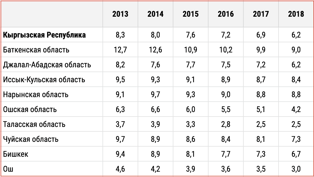 Тенденции уровня безработицы имеют тенденцию снижения, в 2013 году ее уровень составлял 8.3%, а в 2018 году — 6.2%. Исключения составляют Таласская и Нарынская области, где уровень безработицы в 2018 году остался на уровне 2017 года.