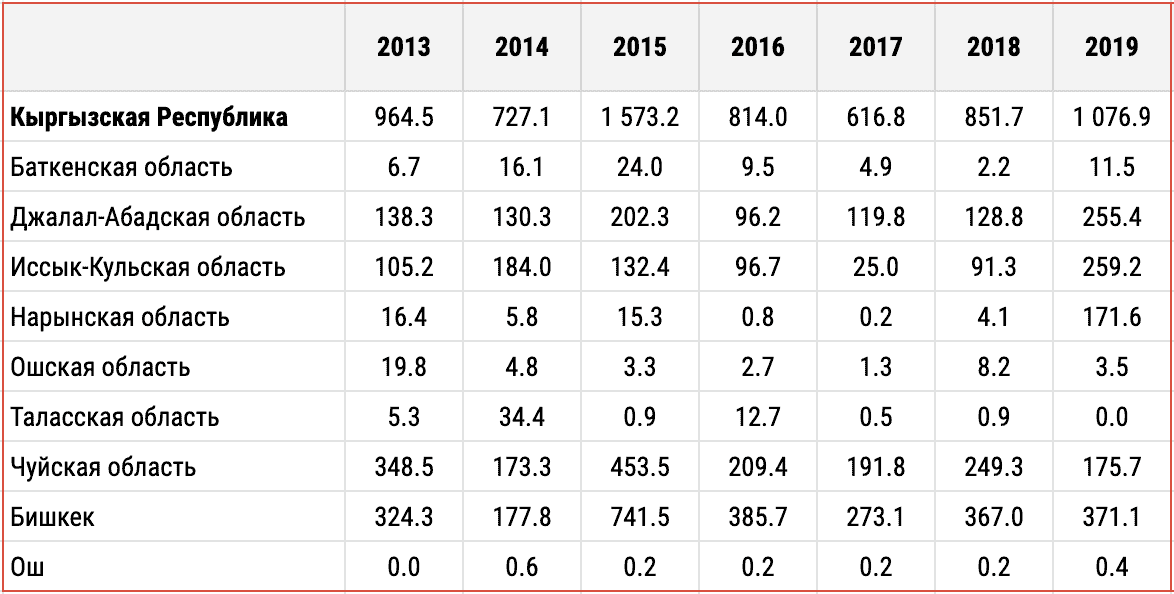 Большая часть инвестиций — 99.2% приходится на четыре региона: Бишкек (40%), Джалал-Абадская область (26.4%),Чуйская (19.2%) и Иссык-Кульская (13.1%).