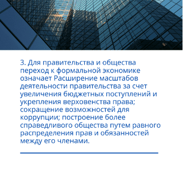 - Дает четкое представление и практические рекомендации по выходу из неформальной экономики и переходу к формальной экономике с помощью комплексных стратегий.
