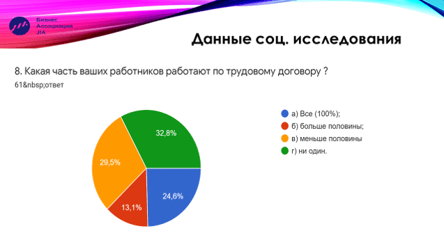 Кроме того, ЖИА провела соцопрос среди 65 предпринимателей, в ходе которого выяснилось, что у трети опрошенных сотрудники работают без заключения трудового договора, у почти трети – меньше половины таких работников, еще четверть заявила о том, что трудовые договоры заключены со всеми.