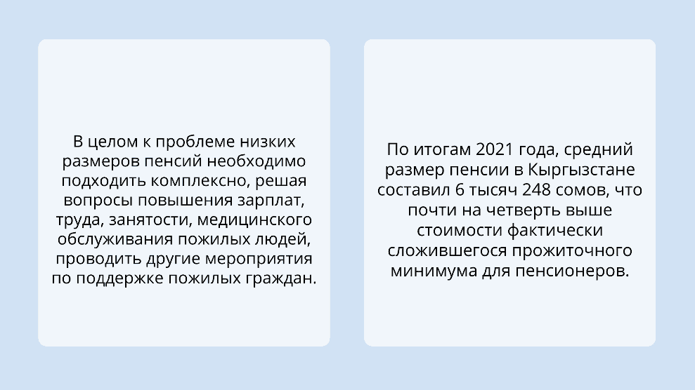 При этом, размеры пенсий льготников при назначении составляют только 50% средней пенсии по республике. Среди новых пенсионеров 16.4% получали пенсию в размере до 2 тысяч сомов (не выше уровня базовой пенсии), 48.8% – от 2 тысяч 1 сома до 3 тысяч сомов, еще 17.4% – от 3 тысяч 1 сома до 4 тысяч сомов.