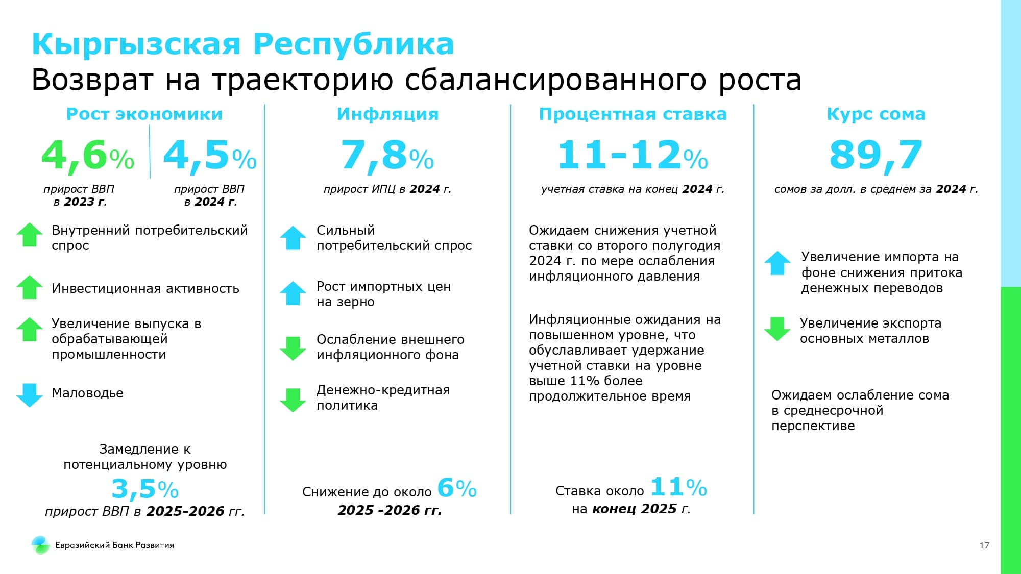 Евразийский банк развития опубликовал новый макроэкономический прогноз по экономикам стран-участниц ЕАЭС на 2024, 2025 и 2026 годы. В Кыргызстане аналитики института развития ожидают в ближайшие три года замедления роста ВВП и инфляции, а также ослабления сома к доллару США.